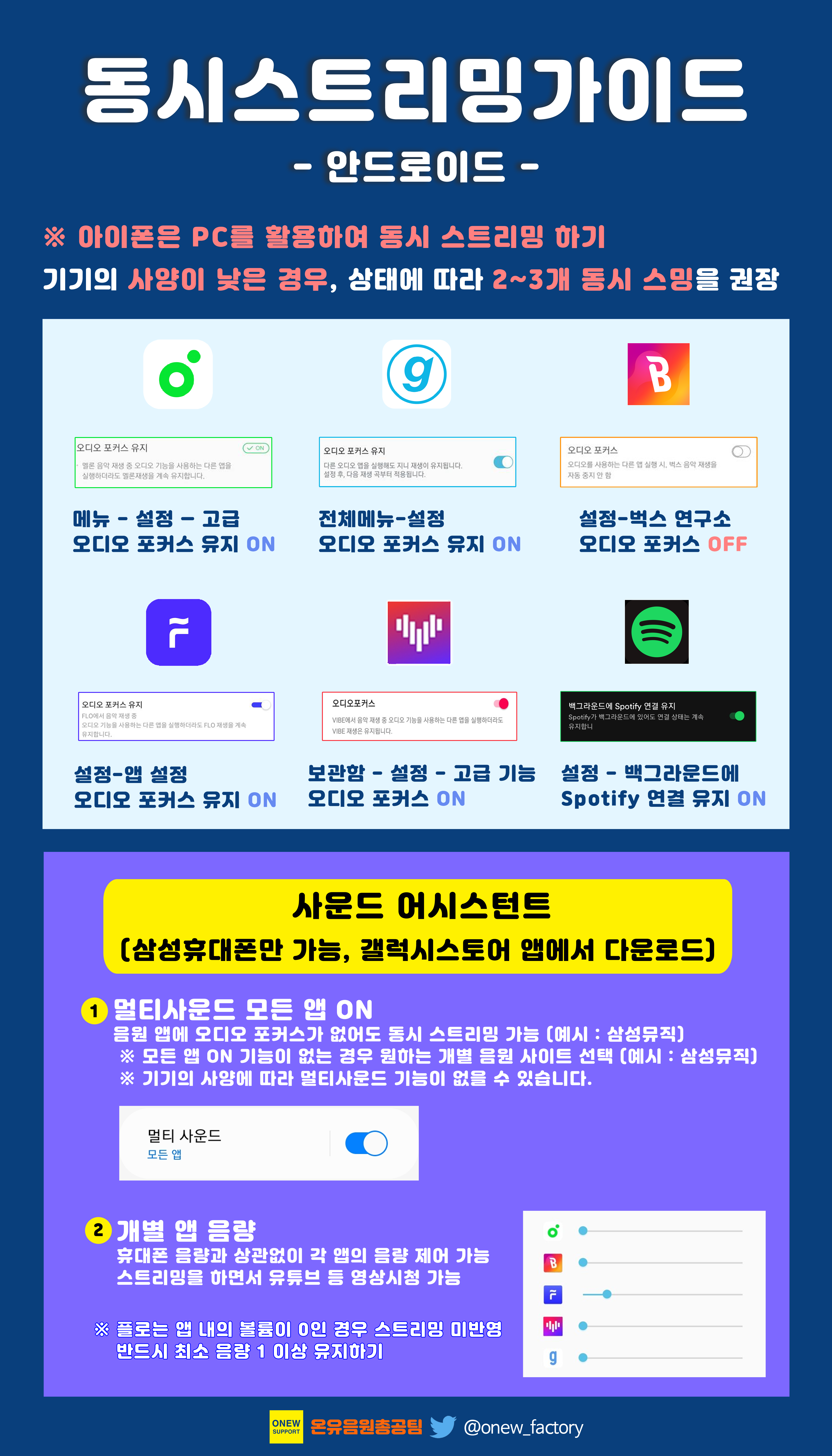 안드로이드의 경우 오디오 포커스 기능으로 동시 스트리밍 가능(멜론, 지니, 벅스, 플로, 바이브, 스포티파이)